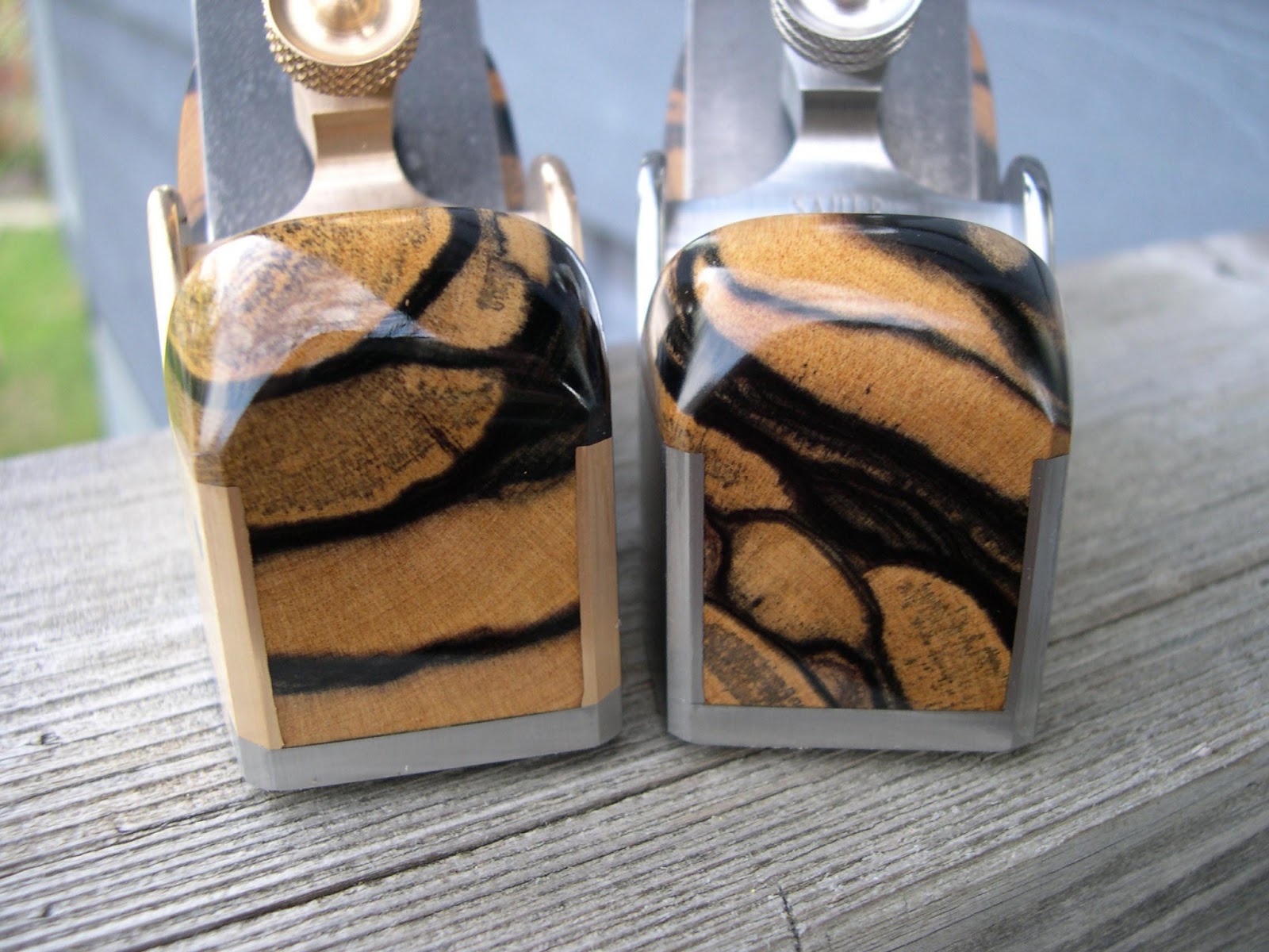 In 2004, I found a stash of Ebony commonly called ‘Black & White Ebony’. There was one piece that stood out to me - it had great definition between the black and white sections and had that wonderful pillowing that Ziricote is known for. It was just large enough for 2 XSNo.4s and I roughed those sets out as soon as I got home. As soon as the dehumidification kiln was completed, they stayed in there for a few years and then back out onto the storage shelf waiting for a home.