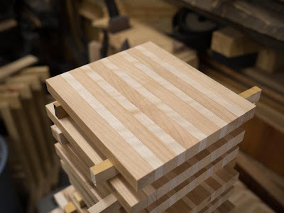 Once all the strips were dimensioned and ready to go, the fun began. Riley did all the arrangements - some in patterns and some were random. We had 15 cutting boards worth, from a very large 14" x 18" down to 7" square.